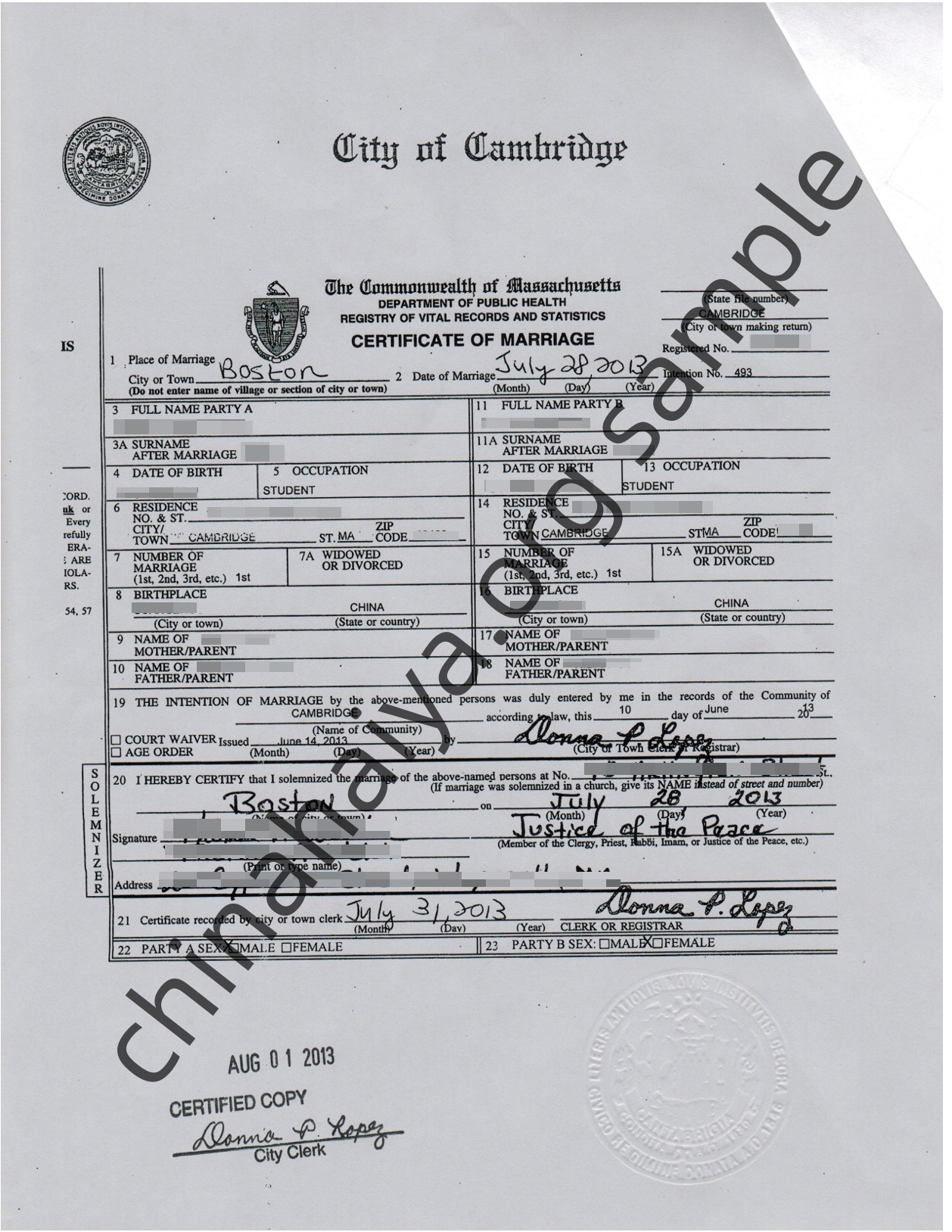 美国结婚证马赛诸塞州办理Certified Copy样本