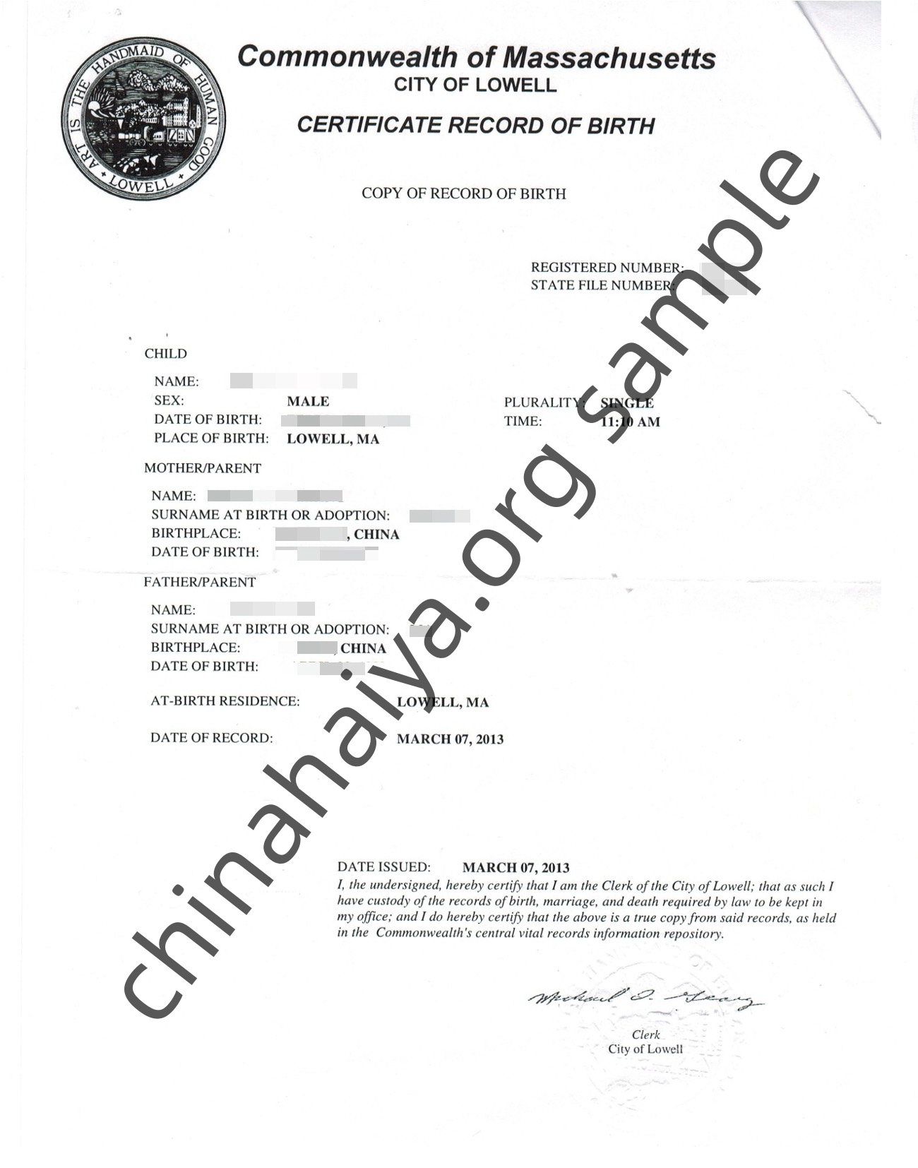 美国马赛诸塞州罗尔市City of Lowell出生纸样本