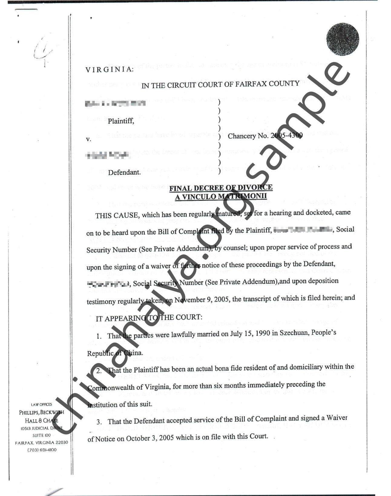 Virginia 离婚判决书 Divorce Decree 认证-DC