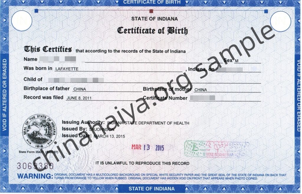 Indiana- 出生证明 Birth Certificate – Chicago