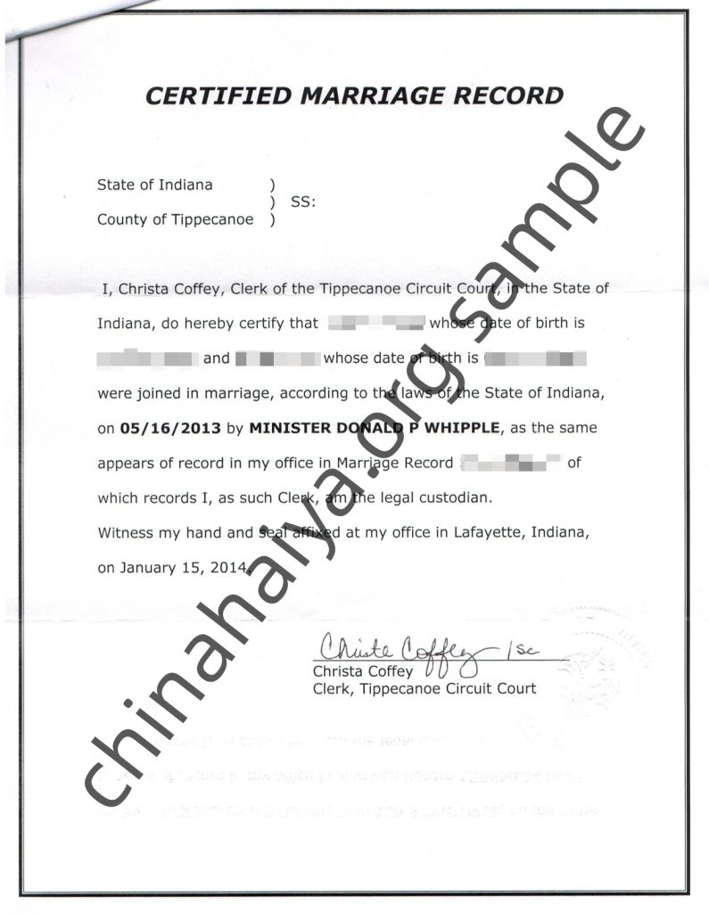 Indiana- 结婚证 Marriage Certificate – Chicago