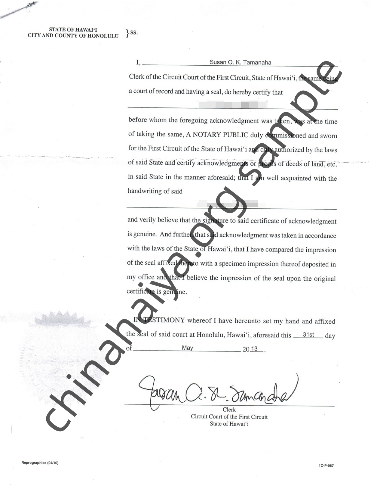 - 联系夏威夷州务卿:在得到法院书记员的认证之后,你需要联系夏威夷州务卿办公室以申请海牙认证。你可以在他们的网站上找到具体的步骤和所需的表格。